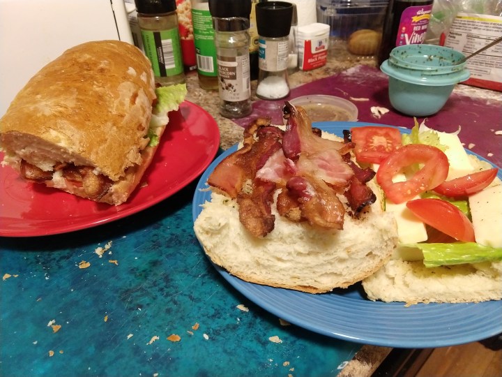 If you want your home to smell amazing, bake some bread. It’s tough to beat the yeasty aroma, unless you happen to follow it up with cooking some bacon which is what I did yesterday. To break in the KitchenAid Mixer that my boyfriend surprised me with (I know, I’m the luckiest :)), I decided to make french bread for BLTs. Or BLTCs, as we added cheese to our sandwiches. While the bread was rising I cooked the bacon. Once the bread was in the oven, we played a few rounds of rummy, then prepped the toppings and a homemade vinaigrette.