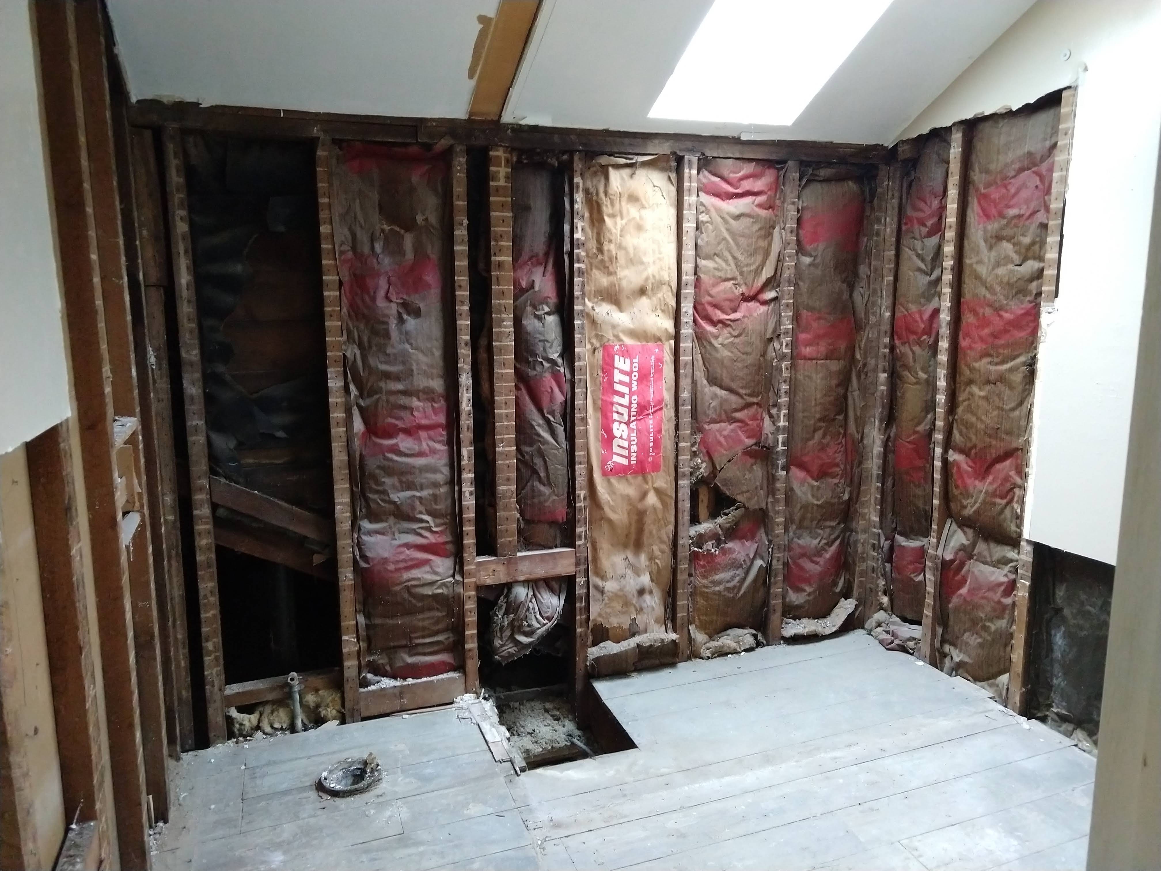 We completely gutted the upstairs bathroom, pictured above. We’re changing the layout slightly and a lot of the existing drywall was in poor condition so that had to go, too.