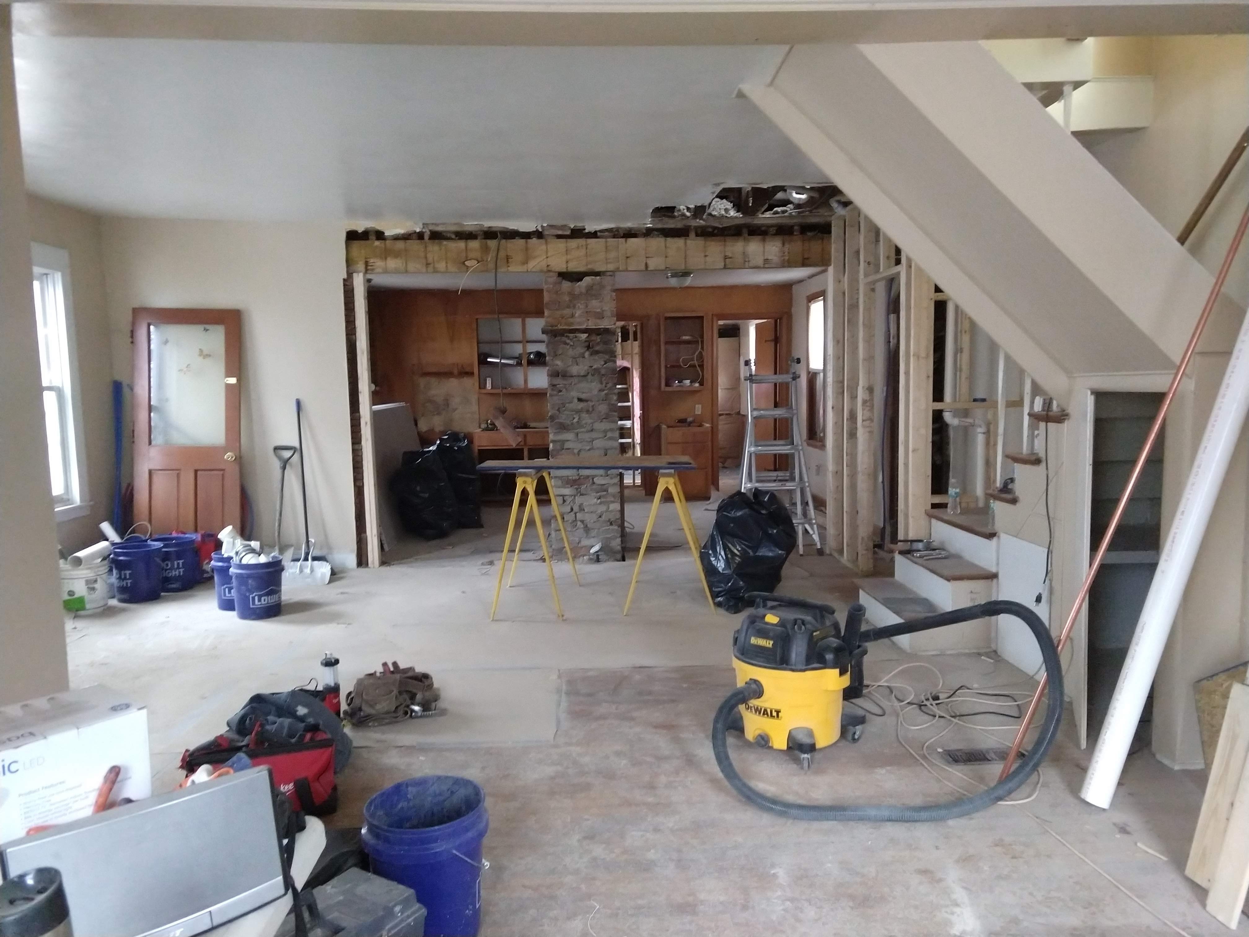 We opened up the wall between the kitchen and living room, which entailed building and installing a massive beam, and exposed the chimney. The plan is to build a peninsula to the right of the chimney for eating/additional counter space. I know it’s very HGTV, but I like the new sight line between the kitchen and living room and the expanded doorway since we opened up the wall. The chimney is in rough shape, so we’ll repair parts of it and likely white wash it.