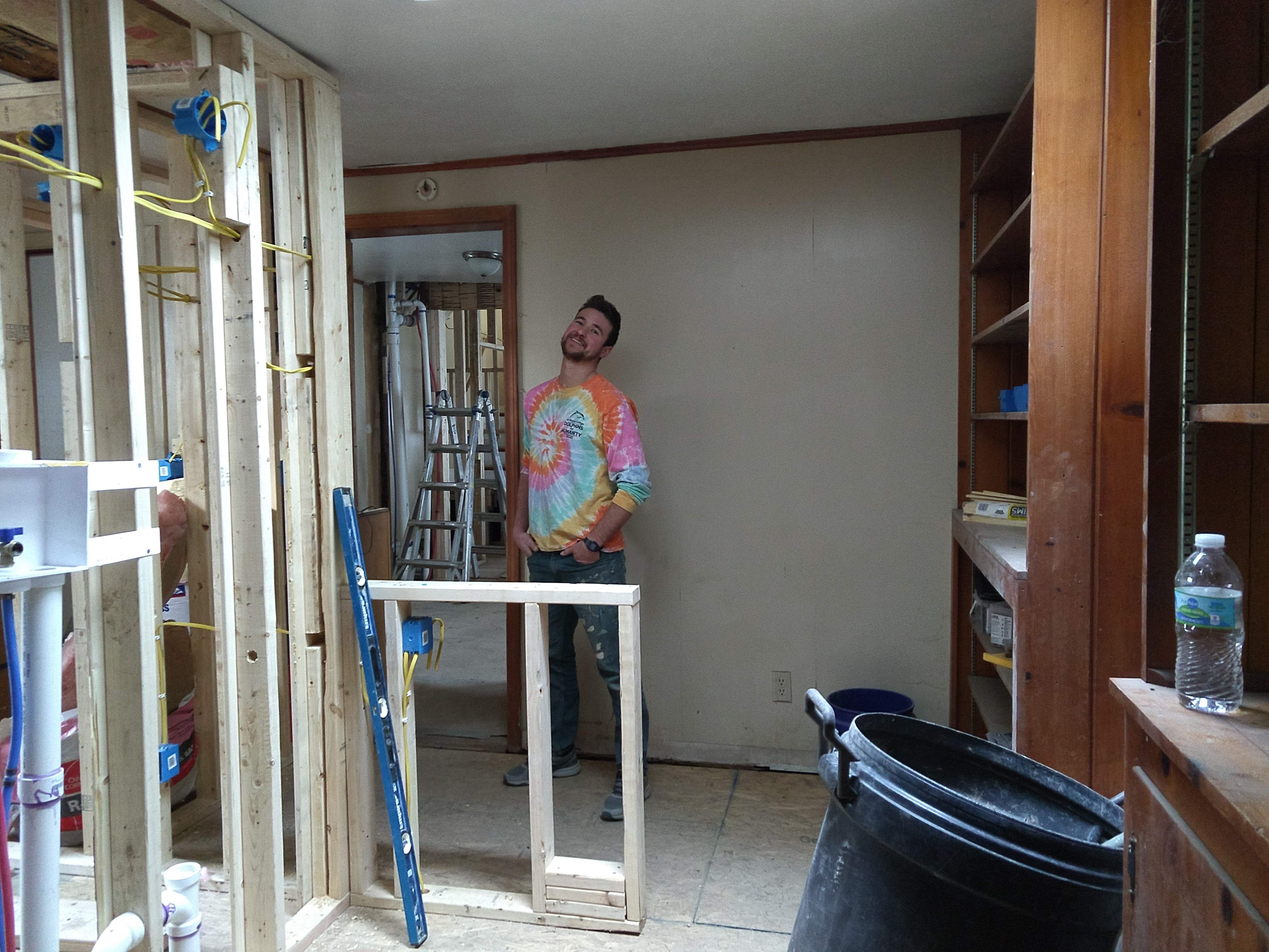 To the left of the staircase, we’ve framed out the bathroom which we moved from the back of the house to make better use of space. You can’t tell from the photos, but we’ve done extensive plumbing work removing existing cast iron pipes and running new PVC and pex lines.