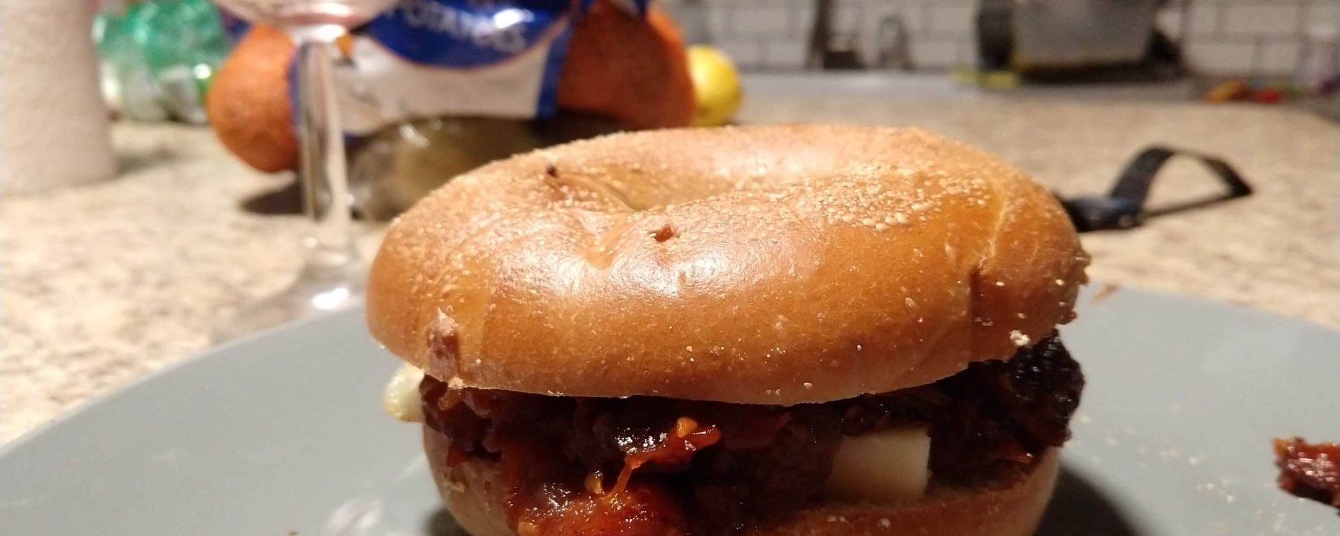 Slow cooked, it takes on a bit of a BBQ flavor profile. I have a hunch it would be good on just about anything, even a lonely spoon (Andrew and I can confirm). We did manage to hold it together long enough to get it piled onto some breakfast sandwiches…for dinner. I have dreams of adding the leftovers to grilled cheese next.